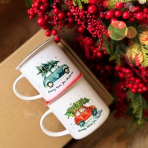 • Zestaw dwóch kubków Świąteczne Samochodziki! Nie znajdziesz bardziej świątecznego zestawu niż ten!  Kubki idealne na mikołajkowy prezent! Zestaw pięknie zapakowany, gotowy do wręczenia! Potrzebujesz upominku na Mikołajki lub pod choinkę? Wybierz ten wyjątkowy zestaw! Kubek to piękna i trwała pamiątka na długie lata! Wspaniale sprawdzi się jako prezent na rocznicę, urodziny czy dla Twojej Przyjaciółki!Kubki mają czerwony i granatowy rant…