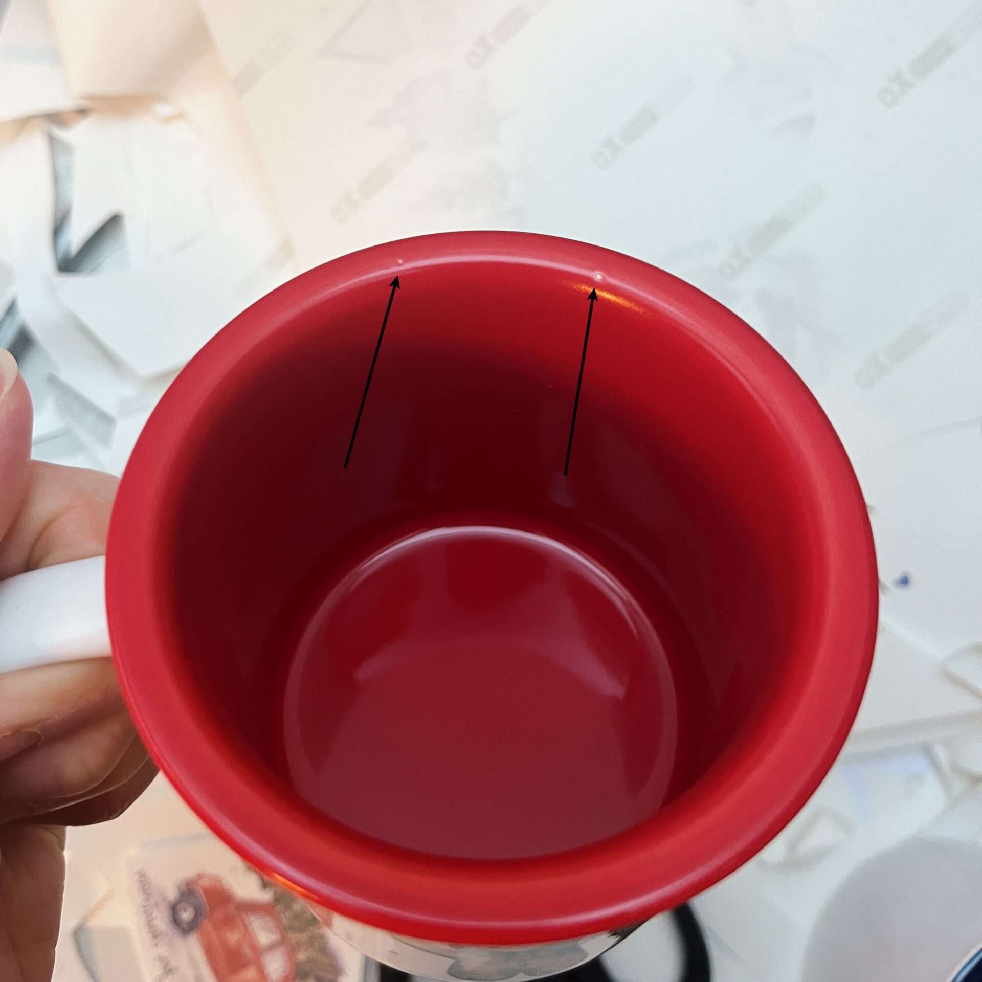SKAZA – skazy (kropeczki) i na krawędzi kubka. Zaznaczone na zdjęciu. Nie wpływają na funkcjonalność kubka!