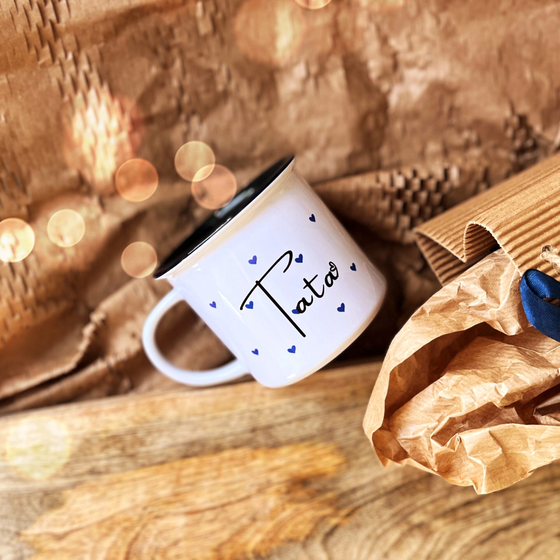 Kubek Tata w serduszka. Kubek ma czarny rant oraz wnętrze. Piękny upominek dla każdego wzorowego tatusia. Sprawdzi się doskonale na urodziny lub jako prezent z okazji nadchodzącego Dnia Ojca.