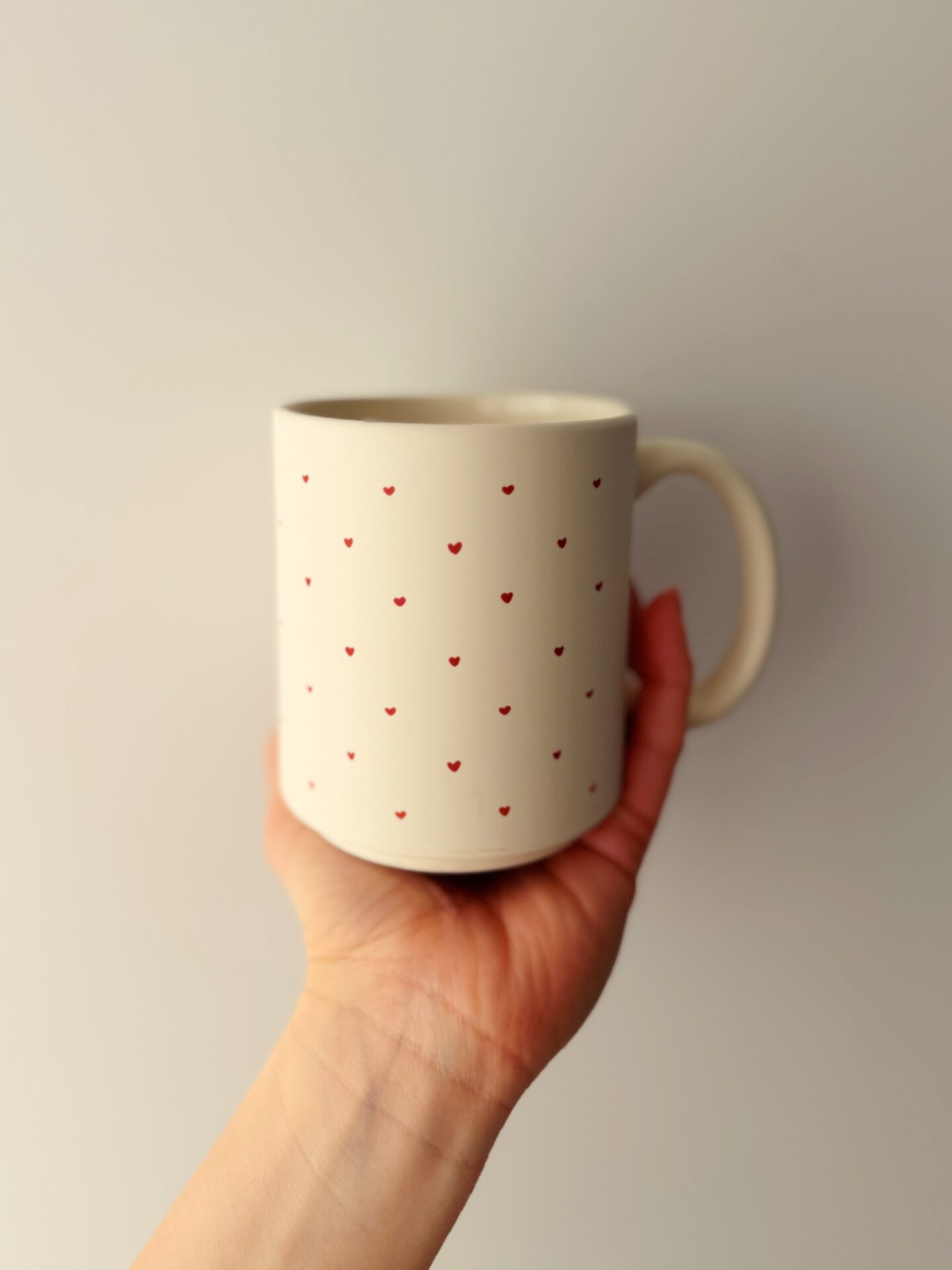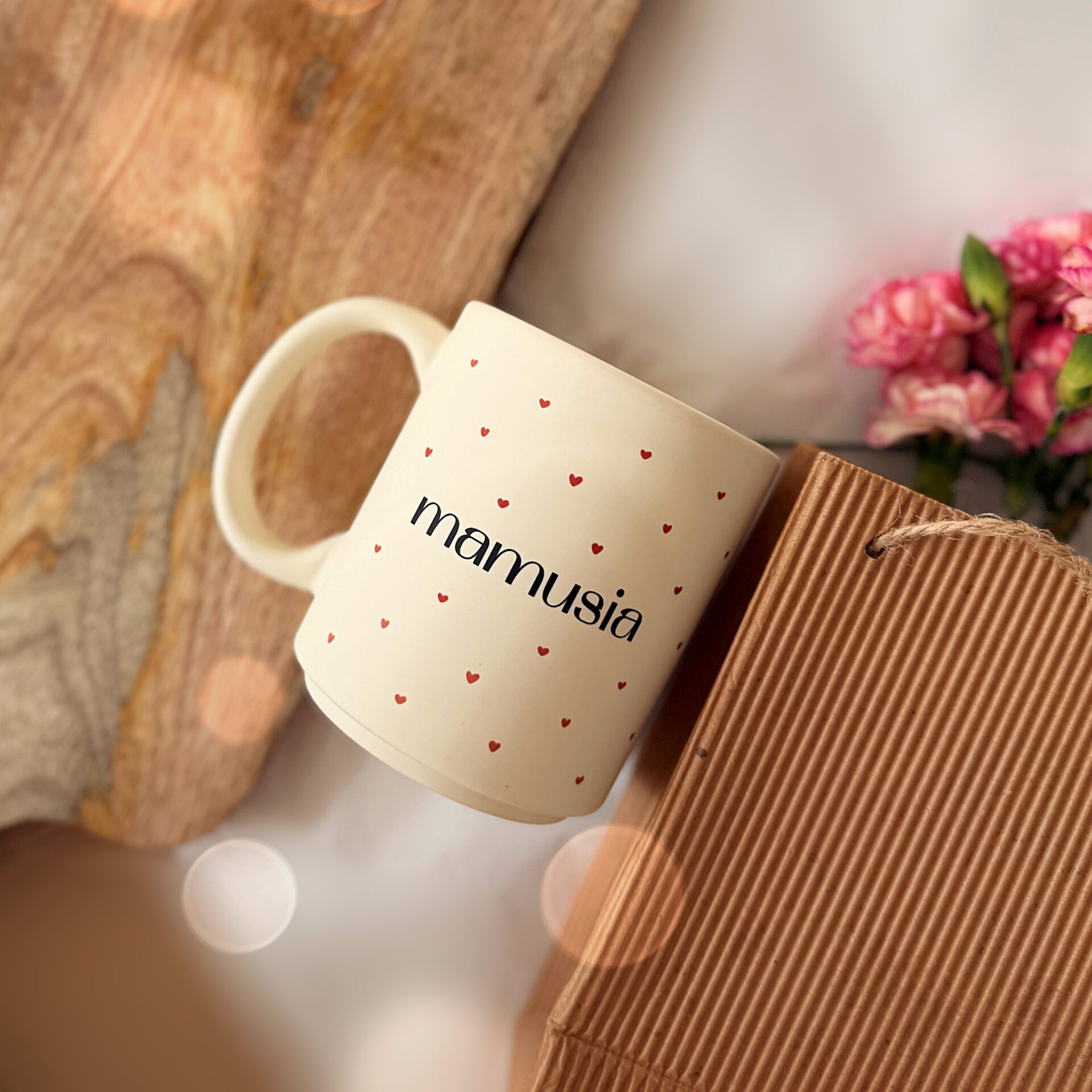 NOWOŚĆ! Kubek Mamusia w pięknym, eleganckim, kremowym kolorze. Kubek jest matowy co nadaje mu jeszcze więcej elegancji. Serduszka są umieszczone dookoła kubka.