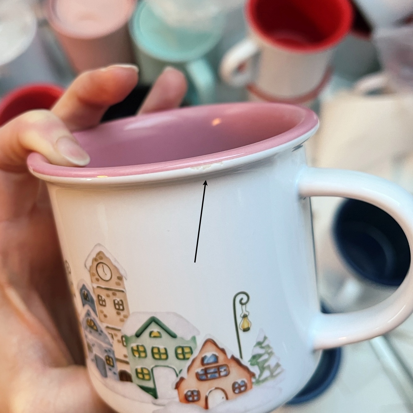 SKAZA – skaza na krawędzi kubka. Zaznaczone na zdjęciu. Nie wpływają na funkcjonalność kubka!