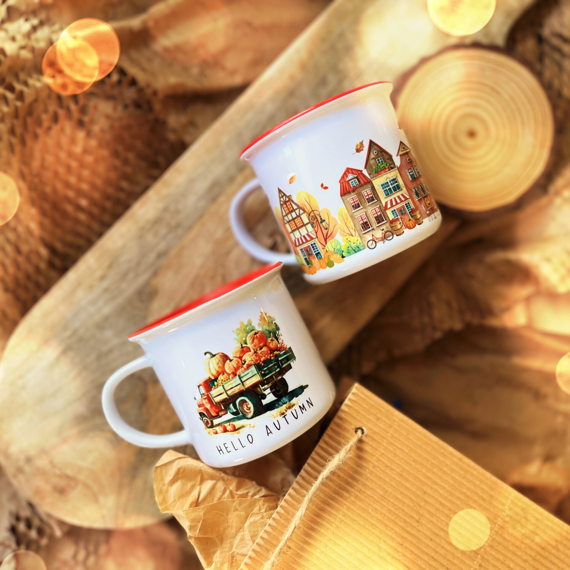 Kubek z samochodem ma grafikę po jednej stronie kubka. Po drugiej stronie możesz umieścić dedykację. Kubek w domki ma dynie wokół całego kubka.